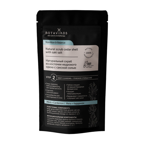 *Измельченная скорлупа кедровых орехов и кристаллы целебной морской соли мелкого помола отвечают за глубокое очищение кожи от загрязнений, удаляют омертвевшие клетки с поверхности кожи, активизируют обменные процессы и способствуют поступлению кислорода и питательных веществ в эпидермис, выравнивают рельеф, придают тонус.