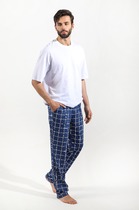 Мужские брюки современного дизайна из футера, по бокам карманы на молнии, отделанные плащевкой и украшенные декоративной кнопкой. Без манжет. Пояс на резинке.