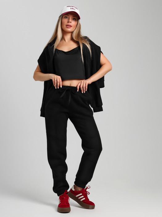 Брюки из трикотажного меланжированного полотна «футер-трехнитка», длинные, с карманами в боковых швах и эластичной тесьмой по талии. Передние половины – из трех частей каждая. Нижние срезы обработаны подгибкой с эластичной тесьмой. В подгибку верхнего среза через две обметанные петли для регулирования степени прилегания брюк по талии вставлен шнур, завязывающийся спереди.