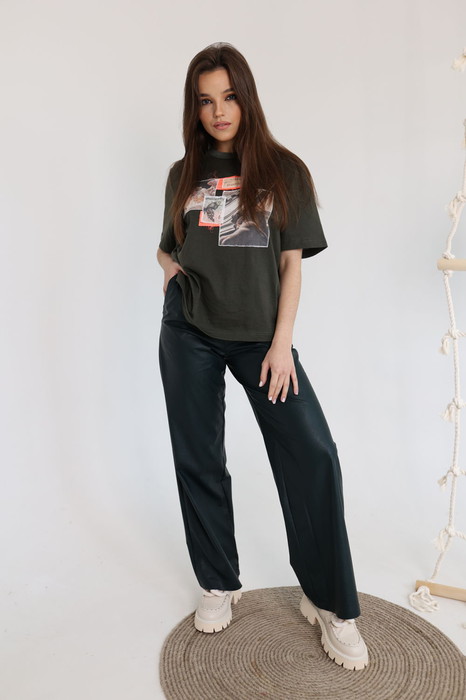 Широкие брюки из эко-кожи на хлопковой основе с резинкой по талии и  боковыми карманами.