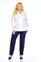 Брюки классические, со стрелками, полной длины, выполнены из однотонной ткани. В области бедер полуприлегающие, в колене и по низу прямые. По передним половинкам обработаны складки по линии талии и наклонные карманы, в среднем шве застежка на молнию. По задним половинкам обработаны талиевые вытачки. Брюки на притачном поясе с эластичной тесьмой и застежкой на петлю и пуговицу.