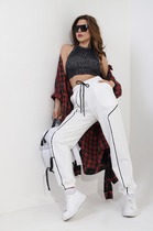 Брюки свободного кроя. Выполнены из текстильного полотна белого цвета в мелкий горошек. В боковых швах карманы с отрезным бочком. Пояс на резинке. На Поясе имеются декоративные строчки. По переду имеется имитация застёжки на 3 пуговицы. Длина 105 см