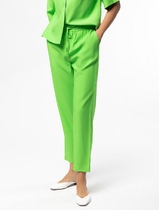 Брюки прилегающего кроя, выполнены из костюмной ткани черног цвета. Характеристики: прилегающий крой, пояс стабильный застежка на молнии с пуговицей, на задней части изделия имитация карманов, передней и задней части брюк застроченные стрелки, в стрелках передней части разрезы. по низу изделия эластичные штрипки. Длина по боковому шву 91,5см.
