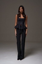 Брюки прямого свободного кроя. Выполнены из мягкой струящейся ткани чёрного цвета. Пояс на резинке. Карманов нет. Длина 109 см