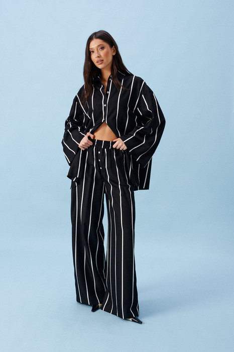 Брюки свободного кроя. Выполнены из вискозной (смесовой) ткани чёрного цвета с белой полоской. Пояс на резинке. По переду имитация застёжки. В боковых швах карманы. Длина с учётом пояса 108 см