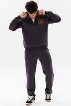 Брюки с карманами на молнии, молнии изнаночные, на замках висит брелок. Слева под карманом печать. На брюках сбоку до колена вставка из ткани черного цвета с печатью. Брюки на манжете