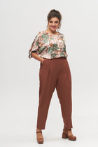 Брюки-палаццо,средней ширины, выполнены с  карманами с отрезным бочком в боковом шве. Пояс притачной, застёжка на молнию. По задним половинкам обработаны вытачки. Длина по боковому шву 109 см, ширина внизу 30,5 см.