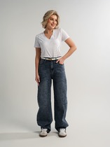 Брюки прямые, классические, с заутюженными стрелками, по переду обработаны карманы с отрезным бочком, застежка на тесьму-молнию и 1 пуговицу. На задних половинках обработаны вытачки и имитация карманов с листочкой, пояс в брюках притачной, по боковым швам резинка. Длина брюк от талии по боковому шву 103 см.
