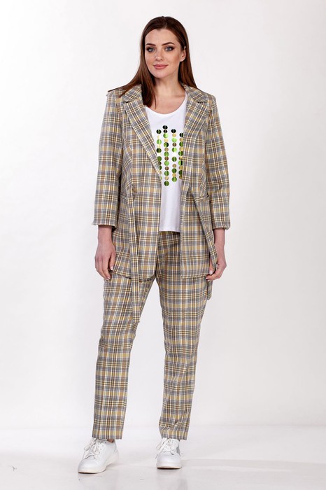 Брюки женские классические  с высокой посадкой, полуприлегающего силуэта, выполнены из костюмной ткани в клетку с добавлением эластана.  Пояс без резинки, с застежкой молнией на пуговицу. В боковых швах карманы с листочкой. Длина брюк 103 см.