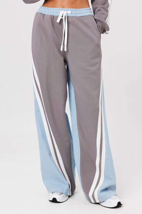 Брюки комбинированные (джинс + трикотаж), прямого силуэта на притачном отстроченном поясе на резинке и втянутым в него декоративным шнурком. По переду карманы в боковых швах с наклонным входом, диагональные рельефы и настрочены широкие лампасы вдоль рельефа. Спинка с накладными карманами.