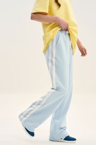 Брюки – из полотна с набивным рисунком в полоску, слегка зауженные книзу, с эластичной тесьмой по талии и притачными манжетами по низу. В центре переда по верхнему срезу прикреплен небольшой декоративный бантик из узкой атласной ленты.