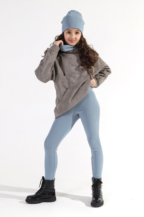 Брюки-легинсы детские из эластичного трикотажного полотна "кашкорсе", плотно прилегающие к телу, без боковых швов. Верхний и нижние срезы обработаны вподгибку. В упаковке с легинсами вы получите стильную шапку и уютный снуд.