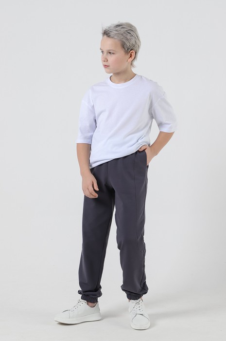 Брюки для мальчика изгладкокрашеного полотна "футер-двухнитка", на притачном поясе с эластичной тесьмой внутри и карманами в боковых швах. Средние половинки - из двух частей каждая, с отделочными строчками по швам стачивания. Нижние срезы обработаны подгибкой сэластичной тесьмой.