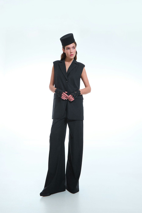 Брюки женские, длинные, прямые. По переду наклонные карманы, застежка на молнию и крючок. На задних половинках вытачки и фиктивные карманы «в рамку». По передним и задним половинкам брюк заутюжены «стрелки».