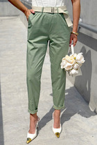 Брюки классические с заутюженными стрелками, слегка зауженные к низу, оформлены притачным поясом, частично на резинке. Застежка спереди брюк на молнию и петлю-пуговицу.