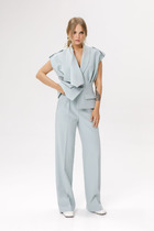 Элегантные брюки прямого силуэта с высокой посадкой и декоративной накидкой спереди. Модель сочетает в себе строгость классических брюк и эффект юбки, создавая выразительный и женственный образ.