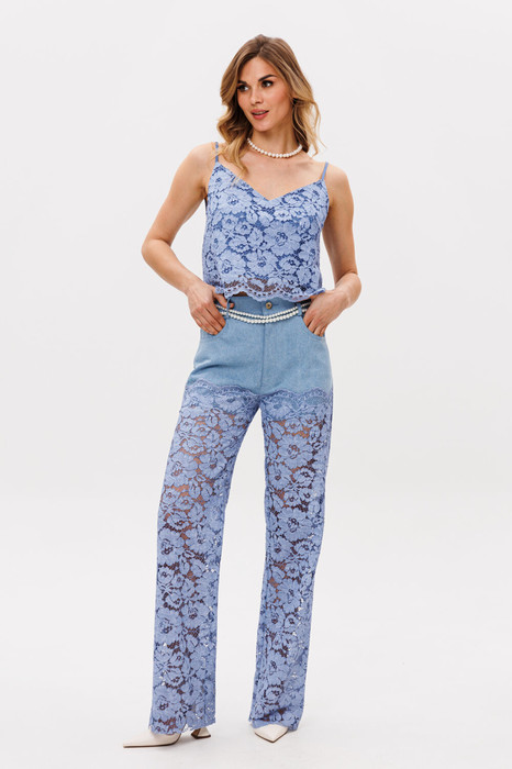 Брюки выполнены из джинса с отделкой из гипюра. Брюки прямого покроя, длиной в пол, на притачном поясе. Верхняя часть брюк выполнена из джинса, нижняя часть из гипюра. Спереди боковые карманы с фигурным входом и застежка на молнию. На задних частях кокетки и накладные карманы. Пояс застегивается на пробивную пуговицу.