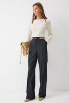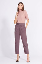 Брюки выполнены из костюмной ткани. Брюки прямого покроя длиной в пол, на притачном поясе с эластичной тесьмой. Спереди боковые карманы с наклонным входом.
