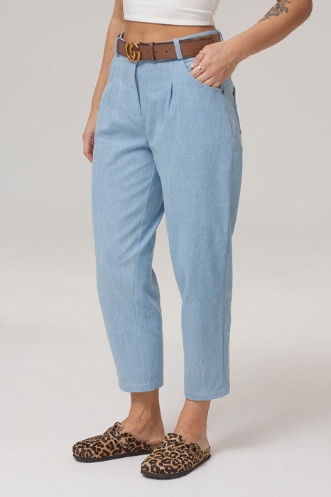 Брюки женские типа «бананы». По переду обработаны фигурные карманы, застежка на молнию, отстрочены складки. Сзади фигурная отстрочная кокетка и фигурные накладные карманы, декорированные металлическими хольнитенами. Верх обработан притачным поясом со шлевками, застегивающимся на кнопку. По низу брюк спереди и сзади отстрочены вытачки.