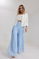 Брюки прямого силуэта, выполнены из шифоновой ткани на подкладке полной длинны. Боковой шов брюк открыт. Синка брюк заходит на перед  по верхней части. Подкладка из не просвещающейся креповой ткани. Верх брюк обработан отрезным поясом. Центральная часть пояса без резинки, остальной пояс на резинке. Низ брюк обработан швом « в подгибку».