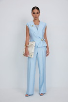 Брюки женские типа «бананы». По переду обработаны фигурные карманы, застежка на молнию, отстрочены складки. Сзади фигурная отстрочная кокетка и фигурные накладные карманы, декорированные металлическими хольнитенами. Верх обработан притачным поясом со шлевками, застегивающимся на кнопку. По низу брюк спереди и сзади отстрочены вытачки.
