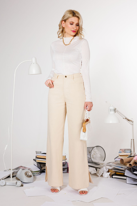 Хлопковые брюки  с разрезами. Застежка на джинсовую кнопку и молнию. По переду выполнены карманы. По заднему полотнищу расположены накладные карманы. Внизу выполнены высокие разрезы.  Брюки  подойдут для повседневной носки и буду сочетаться с любым гардеробом. Материал из которого они выполнены позволит вашей коже дышать, он быстро сохнет и не катается после носки. В брюках завышенная линия талии, что визуально сделает ваши ноги стройнее и длиннее. Длина - 115 см.