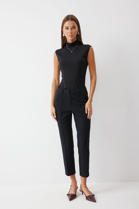 Укороченные брюки прилегающего силуэта из трикотажного полотна. По верху притачной пояс с застежкой и шлевками для ремня. На передних половинках обработаны карманы, защипы и застежка молния в среднем шве. На задних половинках кокетка и защипы. По низу в боковых швах потайные молнии.  Обращаем ваше внимание, что фурнитура может отличаться от фото.