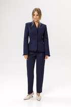Брюки прямого силуэта из трикотажного полотна “замша”. По верху притачной пояс с застежкой на петлю и пуговицу и шлевками для ремня. На передних половинках обработаны карманы, канты и застежка молния в среднем шве, на задних – вытачки. По поясу задних половинок брюк эластичная тесьма (резинка). Обращаем ваше внимание, что фурнитура может отличаться от фото. Декоративный элемент - цепочка в комплектацию не входит.