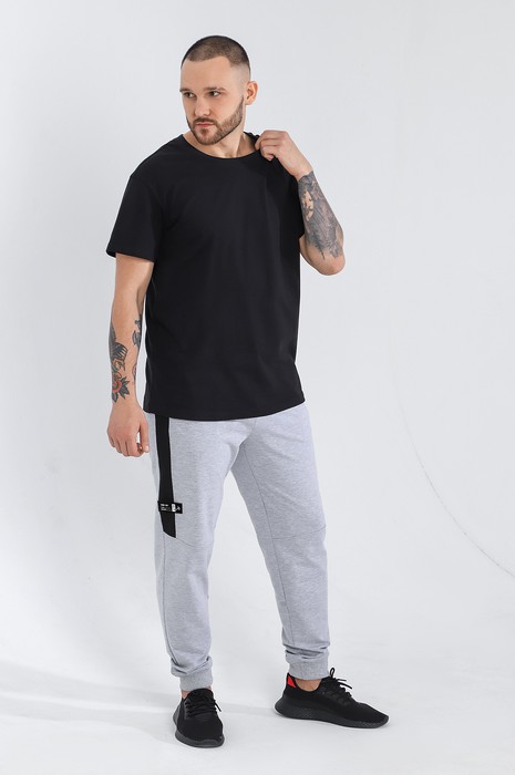 Брюки мужские из футера с лайкрой. Модель с эффектными контрастными вставками, с нашивкой, с боковыми карманами, на поясе с отстроченной эластичной тесьмой и шнуром, по низу на манжетах из кашкорсе.