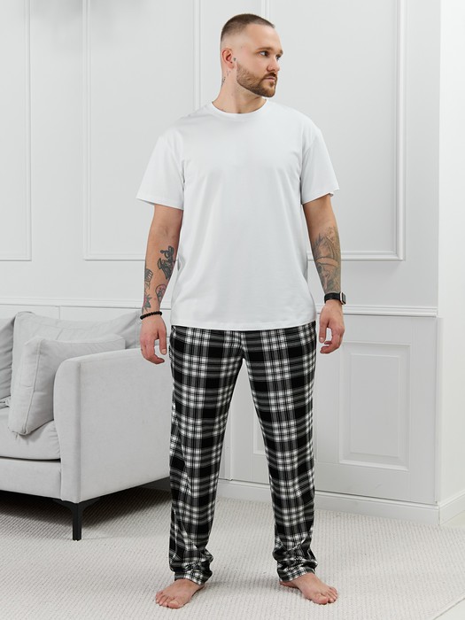 Брюки мужские из трикотажного полотна "кулирка" в клетку, свободного покроя, на притачном поясе с эластичной тесьмой внутри, с карманами в боковых швах. Нижние срезы обработаны подгибкой.