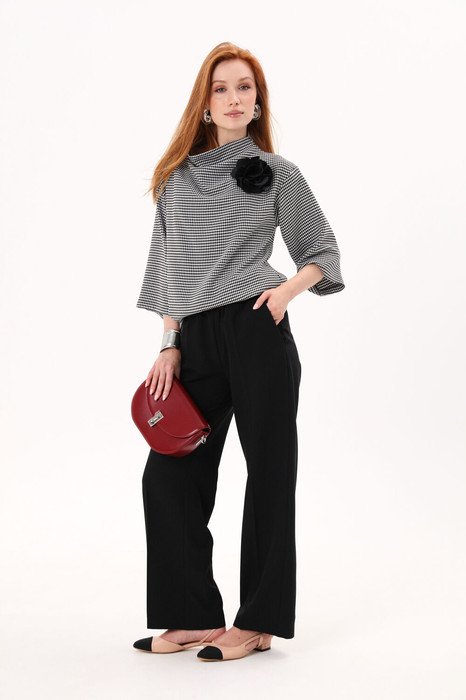 Брюки свободного кроя, верхний срез представлен широкой резинкой, с карманами.
