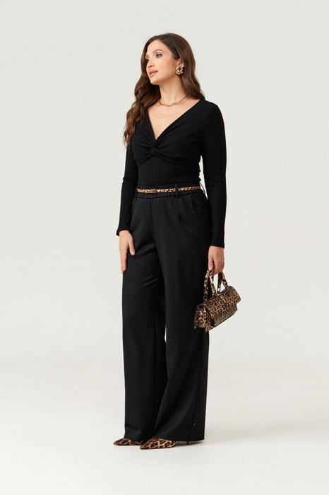 Женские брюки из поливискозной ткани идеально подходят для повседневной носки. Верхний срез обработан притачным поясом со вставкой на резинке, обеспечивающим комфортную посадку. Пояс дополнен шлевками, что позволяет носить их с ремнем для дополнительной регулировки. Передняя часть украшена двумя талиевыми вытачками, создающими аккуратный силуэт. Задняя часть также оснащена двумя талиевыми вытачками, а также имеется карман с листочкой и лейблом с логотипом бренда. Эти брюки черного оттенка сочетают стиль и практичность, делая их универсальным элементом гардероба.