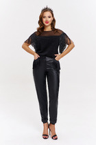 Текстильные брюки-палаццо с высокой посадкой. Детали: высокая посадка, широкие и длинные брюки, притачной пояс со шлевками, передние половины с небольшими застроченными мягкими складками и заутюженными стрелками, застежка на молнию и пуговицу, боковые карманы
