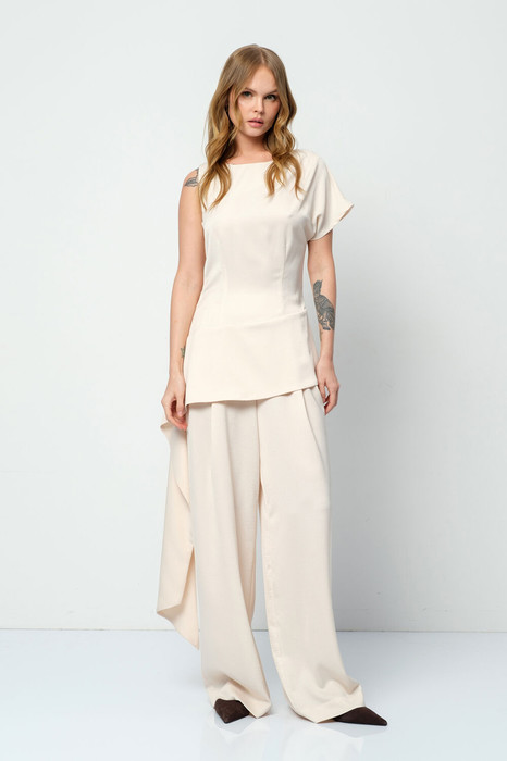 Детали: высокая посадка, передние половины брюк с двумя складками, эластичный пояс-резинка, боковые карманы, без застежки.