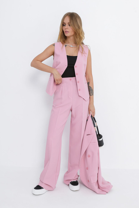 Детали: высокая посадка, притачной пояс со шлевками, передние половины с небольшими застроченными мягкими складками и заутюженными стрелками, застежка на молнию и пуговицу, боковые карманы. Задние части брюк с вытачками и заутюженными стрелками. Пояс брюк прямой, без резинки.
