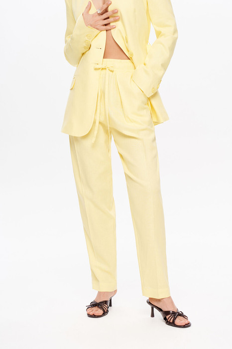 Детали: брюки с высокой посадкой, притачной пояс с резинкой и шнурами, без застежки, боковые карманы, передние части брюк со складками у пояса.