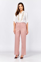 Модель прямого силуэта. В боковых швах карманы. Сзади фигурные накладные карманы с хольнитенами. Пояс притачной, с резиной и кулисой, в которую через люверсы вставлен шнурок из основной ткани с наконечниками. Джинсы декорированы отделочными строчками.