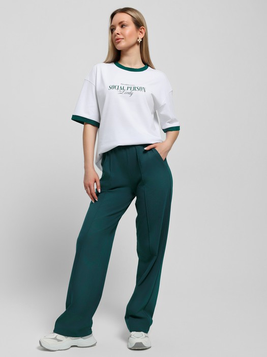 Брюки – из гладкокрашеного трикотажного полотна "кулирка с лайкрой"длинные, классического кроя, на притачном поясе с эластичной тесьмой внутри и карманами в боковых швах. Передние половины брюк застрочены по центральным линиям. По центру пояса настрочен декоративный элемент