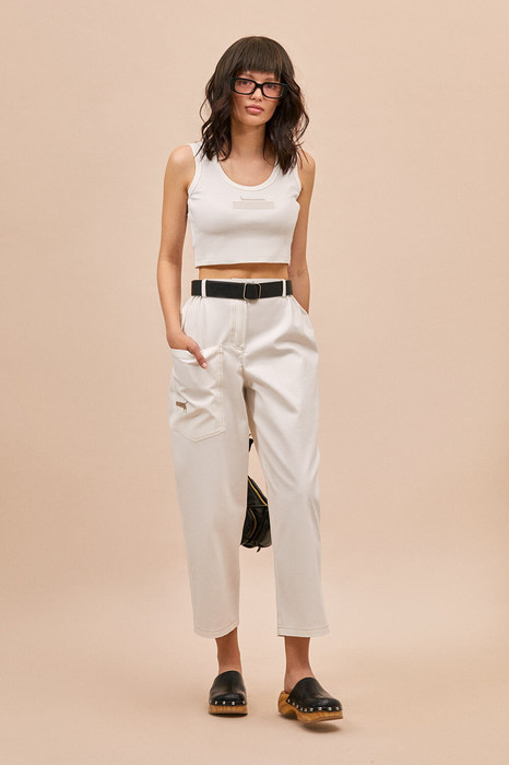 - притачной пояс с резинкой по бокам, шлевками для ремня и кожаной аппликацией с логотипом