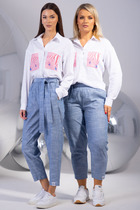 Брюки женские из трикотажной хлопковой ткани (двунитка), слегка заужены к низу. В боковых швах расположены карманы. По низу передних половинок есть защип. Задняя половинка брюк с отрезной кокеткой и накладными карманами. Вверх брюк обработан поясом с резинкой (без молнии).  ПОЯС  ВХОДИТ В КОМПЛЕКТ.