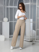 Брюки женские из трикотажной хлопковой ткани (двунитка), слегка заужены к низу. В боковых швах расположены карманы. По низу передних половинок есть защип. Задняя половинка брюк с отрезной кокеткой и накладными карманами. Вверх брюк обработан поясом с резинкой (без молнии). ПОЯС ВХОДИТ В КОМПЛЕКТ.