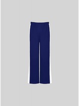 Брюки женские из трикотажной ткани (двунитка), слегка заужены к низу. По переду брюк расположены накладные карманы. На левом кармане  настрочной декоративный элемент. В пояс вставлена резинка по кругу.
