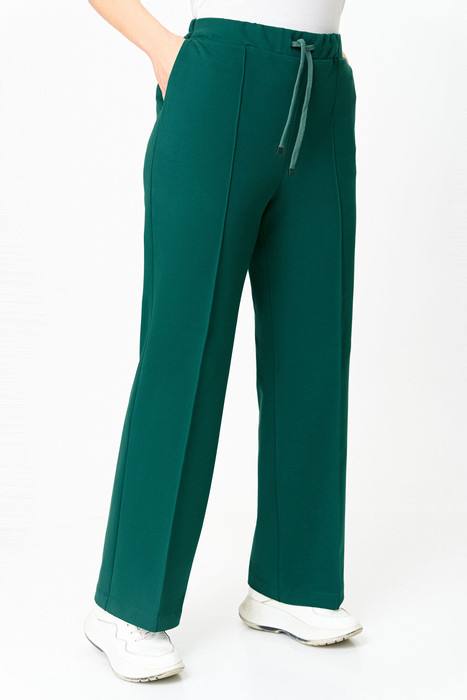 Брюки женские спортивного стиля из эластичного хлопкового полотна, прямого от бедра кроя. По передним половинкам брюк расположены фигурные карманы. По передним и задним половинкам отсрочены канты. Пояс брюк притачной с эластичной тесьмой-резинкой, в передней части пояса вставлен декоративный шнурок с металлическими наконечниками.