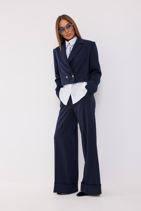 Брюки прямые. Верх на поясе со шлёвками. Пояс декорирован съёмным поясом на петли и пуговицы.  Застёжка по переду на молнию и крючок на поясе. Боковые наклонные карманы. Низ брюк на манжете.