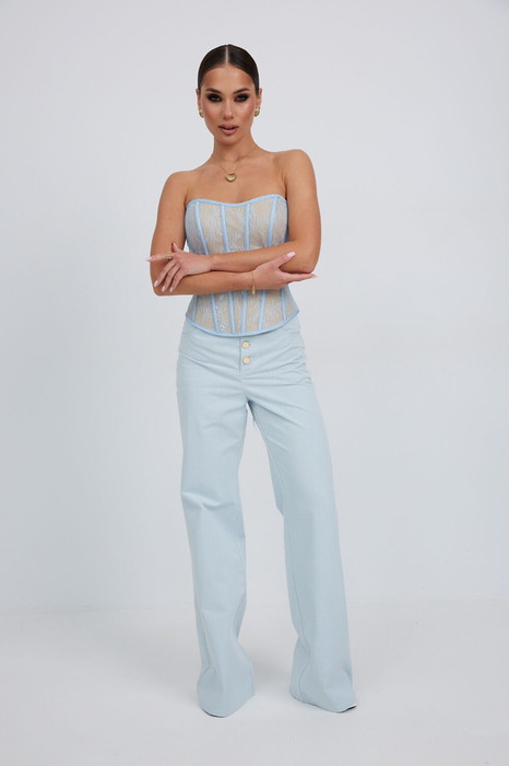 Брюки клёш из джинсовой ткани. Верх на притачном поясе со шлёвками. Высокая посадка. Застёжка спереди на петли и пуговицы-болты. По переду боковые карманы. По задней части кокетка и накладные карманы. Отделка контрастной нитью.