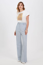 Широкие брюки глубокого синего оттенка, свободно свисают, создавая плавные линии и элегантную силуэтность. Ткань, из которой они выполнены, обладает текстурой, придавая образу нотку роскоши и комфорта. Брюки идеально подчеркивают фигуру, создавая стильный и уверенный вид. Брюки свободного силуэта, расширяются к низу. Пояс притачной на резинке, что обеспечивает максимально удобную посадку на любой тип фигуры, в боковых швах карманы. Длина брюк 108 см.