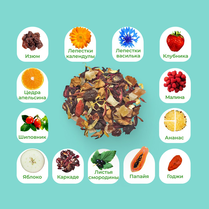 Смесь дополнена красным изюмом, ягодами Годжи и измельченными плодами шиповника, приправлена цедрой апельсина, листьями смородины и цветочными лепестками календулы и василька.