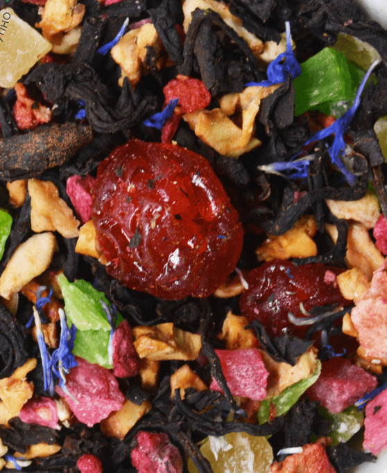 Купаж из индийского черного чая асаам, с добавлением цукатов, кусочков сушеного яблока, вяленой вишни, кусочков сублимированной клубники и малины, лепестков мальвы.  Содержит пищевые ароматические масла.