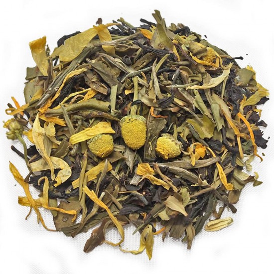 Чай черный, чай зеленый, мята, цветы ромашки, лепестки календулы.