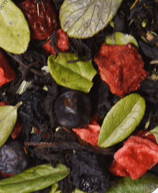 Купаж из классических черных индийских чаев с добавлением листьев смородины и брусники, почка сосны, плодов можевельника, кусочков сублимированной клубники, вишни, ароматитзирован аромамаслами.